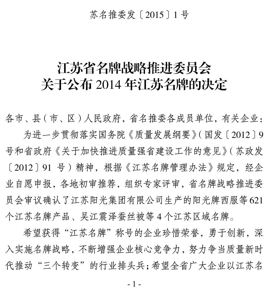 日前,江苏省名牌战略推进委员会公布了2014年江苏省名牌产品名单,“