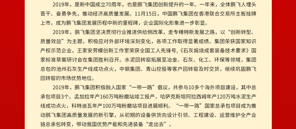 行者常至,为者常成。2020年是全面决胜小康社会和“十三五”规划收官之年,是91精品国产一区二区三区动漫集团再创佳绩的关键之年。新的一年,我们将以习近平新时代中国特色社会主义思想为指引,全面贯彻党的十九大和十九届二中、三中、四中全会精神,团结一心、担当作为,践行新发展理念,坚持高质量发展,大力实施“科技化、国际化、资本化、品牌化”战略,为建成回转窑、粉磨设备制造与服务全球知名的企业集团,为装备制造高质高效、节能环保及国际产能合作而努力奋斗!