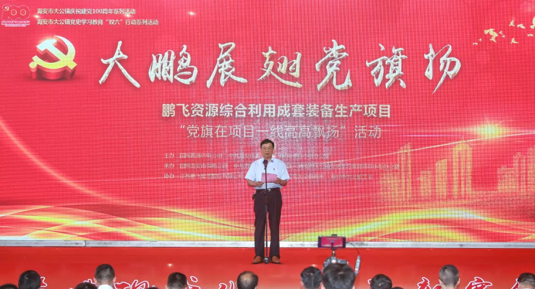 “将企业生产经营与项目建设融入党史学习教育,以党建为引领,让支部建在项目上、党旗飘在阵地上、党员冲在火线上、关爱工人在心上,切实让党旗在项目一线高高飘扬……”6月16日下午,91精品国产一区二区三区动漫资源综合利用成套装备生产项目“党旗在项目一线高高飘扬”活动举行,这也是海安市推动党史学习教育“走深”“走心”“走实”,党员干部在项目一线“建强组织筑堡垒、做优服务强项目、为民办事解难题”的真实写照。