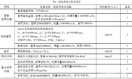 根据该项目的建设规模和地处高海拔地区这一特殊情况,熟料烧成系统设计采用了一套改进型双列五级CDC二代预热预分解系统、Φ4.8 m×72 m回转窑和第四代S型篦式冷却机等设备组成的窑外分解煅烧系统,日产熟料4 000 t,熟料烧成热耗3 554.36 kJ/kg(850 kcal/kg)。本配置在平原地区其熟料生产能力可达到5 500 t/d左右。系统主要设备配置见表1。