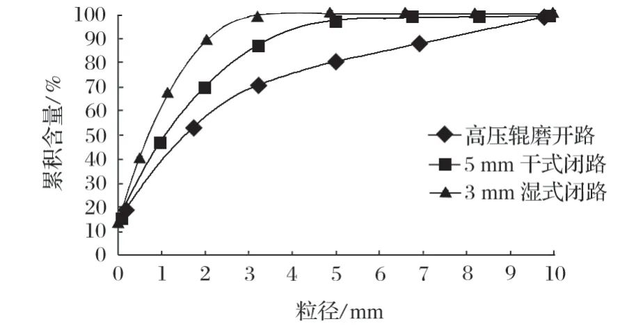 图4 不同高压辊磨工艺流程产品粒度曲线