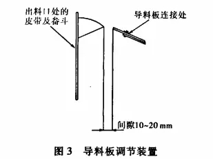 由图3可见,间隙应调整在10-20mm,不能太大,也不能太小。间隙太小,机组运行时,畚斗与导料板相碰,无法运行。间隙太大,则回料太多,导致机组箱体内堵料而停车。导料板系易损件,平时应经常检查导料板的磨损情况,做到及时更换,并保证安装牢固。