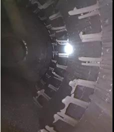 原出料篦板为筛板外加铸件边框的防堵型篦板,篦缝为 5~ 8 mm,此种篦板虽有防堵效果,但磨尾的粗颗粒物料与钢段会从篦板之间的缝隙中进入到选粉机,再进入磨机一仓。