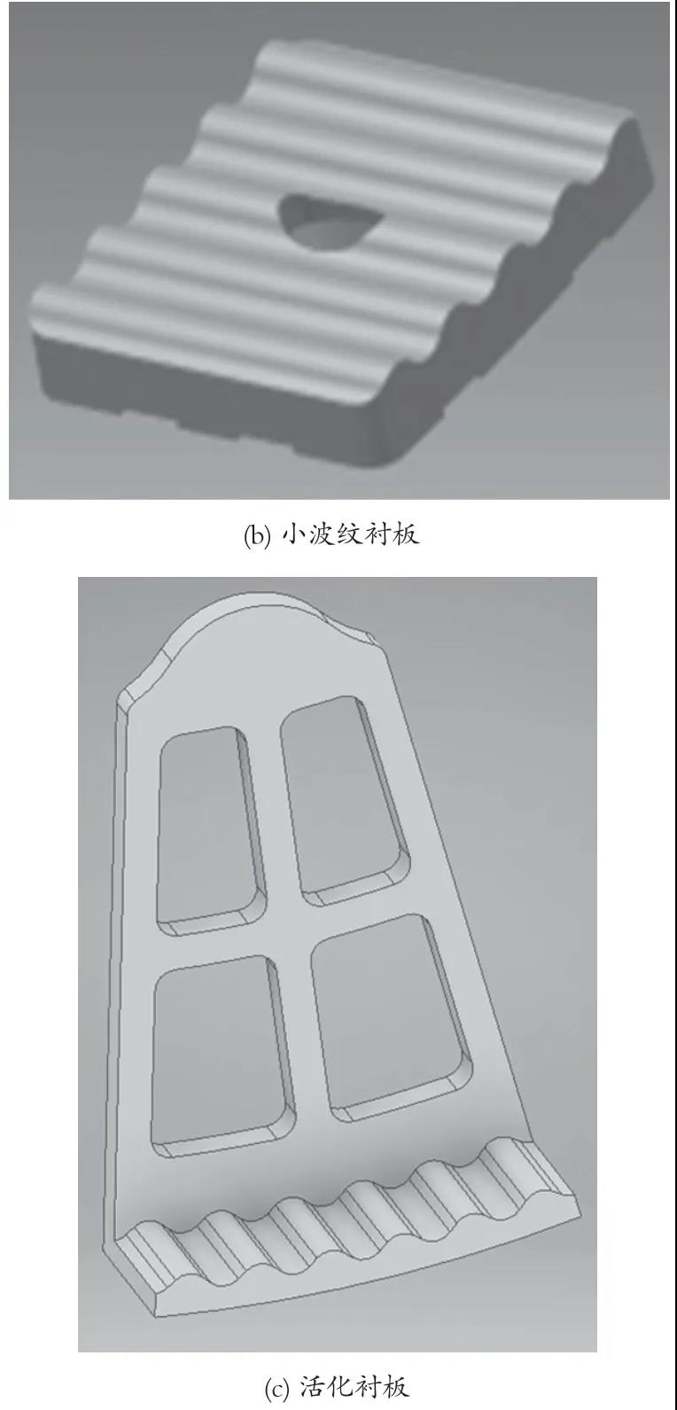 优化前筒体衬板如图 1 所示。一仓采用沟槽阶梯衬板,其有效长度为 3.15 m,沟槽阶梯衬板有磨损,阶梯的高度差和沟槽可进一步优化;二仓采用小波纹衬板+4 圈活化衬板,小波纹衬板厚度为 75 mm,降低了有效内径,增加了电耗,活化衬板磨损严重,排列方式可进一步优化。