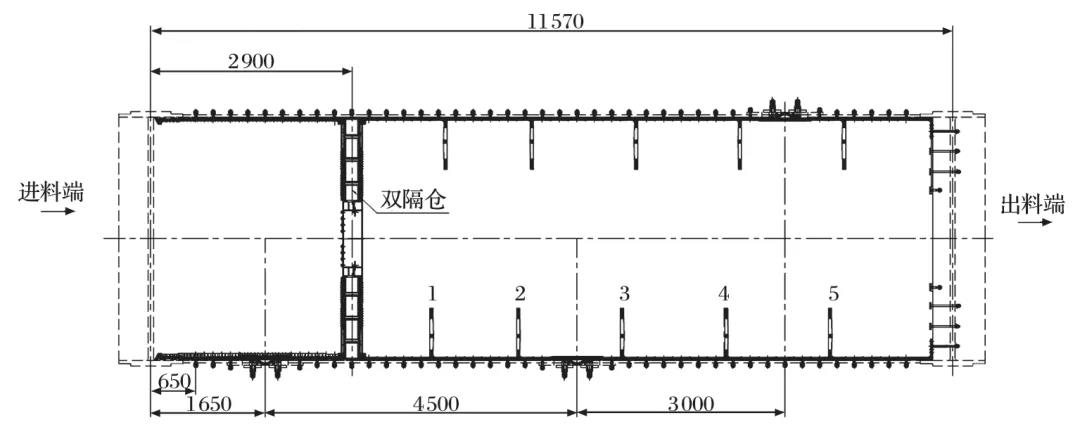 结构方面,在考虑研磨体填充率与料面的情况下,尽可能增大中心圆的直径,隔仓两侧采用篦板,篦缝宽度为 6 mm,通孔率为 7.8%,两侧篦板的通孔率保持一致,可改善隔仓截面通风,降低通风阻力和中心圆处风速。物料流动方向安装有闸板,现场可根据粉磨工艺及物料特性等来控制物料的流速,从而提高产品的质量和产量。