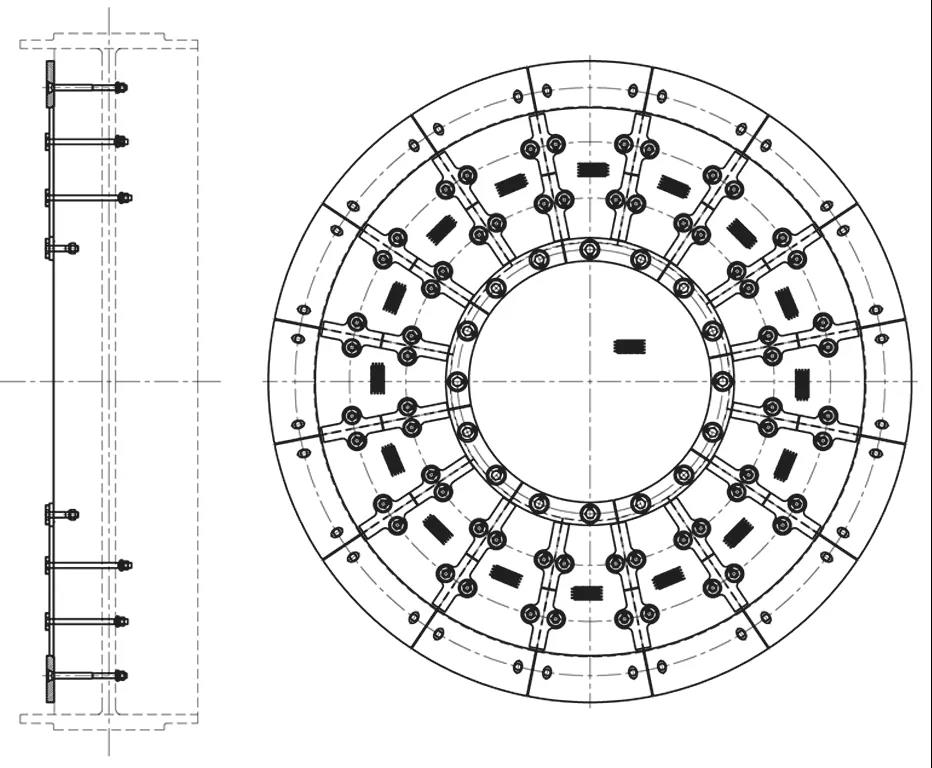 优化后的筒体衬板如图 2 所示。一仓仍采用沟槽阶梯衬板,阶梯的高度差决定了衬板的提升能力,沟槽的波纹兼顾研磨作用。优化后衬板的阶梯高度差为100 mm,沟槽的半径为 R20 mm,深度为 10 mm,提高了衬板的提升和研磨效率,可更好地发挥一仓以细碎为主、研磨为辅的作用。二仓为小波纹衬板+5 圈活化衬板。小波纹衬板的波纹重新设计,波峰波谷高度差为 15 mm,尽可能地增大研磨面积,以提高二仓的研磨效率,增强研磨能力。考虑研磨体填充率为30%,活化衬板高度为 750 mm,环数增加至 5 圈,重新排列活化衬板的安装位置 (见图 3),每一圈的活化衬板交错排列,可更好地发挥研磨体的粉磨能力,最大程度消除研磨死区;合理设计活化衬板的过料面积,将靠近筒体外圆高度为 150 mm的部分设计成盲板,可有效控制物料在磨内的研磨时间,提高磨机研磨效率和物料的磨细程度,降低循环负荷,从而提高产量、降低电耗。