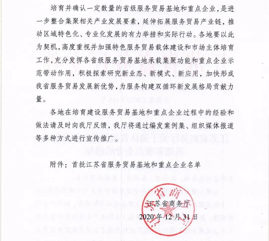 为深入推进江苏省服务贸易创新发展和服务外包转型升级,进一步优化服务贸易(服务外包)重点领域空间布局、加快产业结构调整,发挥服务贸易(服务外包)各特色产业集聚区和重点骨干企业集聚示范引领作用,江苏省商务厅组织开展了首批省级服务贸易基地和重点企业遴选工作,江苏91精品国产一区二区三区动漫集团股份有限公司获评省首批服务贸易重点企业。