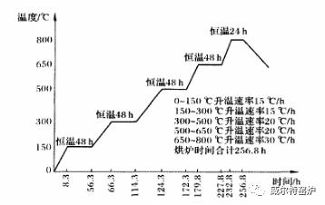 第一个温度点是150℃。此温度点主要是完成砌体中游离水的蒸发。因为水在100℃时变为水蒸气,但蒸发不快,故必须大于100℃时才能有效干燥。根据经验选150℃为宜,此阶段脱水量不大,不能太快。如果水分排出太快,内部残存水分扩散速度赶不上表面蒸发速度,内部水会受热变成蒸汽产生膨胀致使泥浆收缩发生龟裂,降低粘接强度,削弱砌体强度,浇注料更是如此。因此,由常温至150℃的过程中,升温不能太快,控制在10℃·h-1为宜,当达到150℃时,还必须保温一段时间,保证砌体充分干燥。