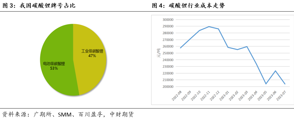 2、需求方面(1)广东省作为国内3C电子商品制造消费大区,其锂电池产业基础雄厚,拥有最完善的锂电池产业链,涵盖了从上游金属矿产资源、电池材料,到中游电芯制造及PACK组装,再到下游锂电池应用及电池回收利用的全产业链。(2)碳酸锂的主要终端消费为新能源产业(电动汽车、储能)及3C消费类电池。根据市场反馈,2023年6月我国新能源汽车产销分别完成78.4万辆和80.6万辆,同比分别增长32.8%和35.2%,市场占有率达到30.7%。6月我国动力电池产量共计60.1GWh,同比增长45.7%,环比增长6.3%。其中三元电池产量17.7GWh,占总产量29.4%,同比下降4.2%,环比下降4.9%;磷酸铁锂电池产量42.2GWh,占总产量70.3%,同比增长86.3%,环比增长11.7%。6月,我国动力电池销量共计52.2GWh,同比增长9.9%。其中三元电池销量18.4GWh,占总销量35.2%,同比下降16.8%;磷酸铁锂电池销量33.7GWh,占总销量64.5%,同比增长33.0%。6月,我国动力电池装车量32.9GWh,同比增长21.8%,环比增长16.5%。其中三元电池装车量10.1GWh,占总装车量30.6%,同比下降13%,环比增长11.6%;磷酸铁锂电池装车量22.7GWh,占总装车量69.1%,同比增长47.5%,环比增长18.7%。(3)今年5月中旬开始,储能市场需求逐渐向好,磷酸铁锂市场开工率上涨,带动了碳酸锂的需求量,预计下半年储能市场需求增量显著。进入7月份以后,随着3C数码市场出口贸易的订单逐步完结,需求又恢复平淡。动力市场活跃度虽有增强,但还未完全恢复,终端的汽车动力电池需求量仍较为有限。正极材料企业多有备货,碳酸锂高价向下传导困难,放缓了备货节奏,观望市场走势,采购较为谨慎。(4)下游企业基本采用随行就市的报价模式,根据原材料价格来拟定交易合同。开工率受订单影响,上半年动力市场订单状况不佳,总体较去年没有稳定增长;3C消费端海外订单增量明显,进出口贸易状况良好;储能市场逐步增量,但订单、需求、价格等向上传导仍需时间,目前碳酸锂的需求端情况仍较弱。(5)今年碳酸锂价格大幅下跌,上游贸易商违约率不高。国内订单在市场价格波动剧烈的影响下,视价格行情分成两种情况,原材料价格上涨时,上游企业较为强势,原材料价格下跌时,下游较为强势,会取消原有订单报价,签署新订单。出口的贸易订单极少违约,且因今年碳酸锂价格回落的缘故,今年新开工生产的销售利润率较高。(6)目前下游的供应和销售情况皆平稳,原料库存一般维持在2周左右。