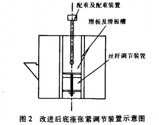 原来设计的配重装置采用两边齿条,通过配重和下滚筒的自重进行皮带张紧,两边调节装置同时调节皮带的跑偏情况。从理论上讲没有问题,但实际使用中皮带两边跑偏严重,无法进行调整,增大配重或偏向提升或下沉齿条都无法解决问题。经研究分析,我们将配重连接M32的丝杆,在导向板的下半部分设置调节装置,解决了问题。改进前后见图1、图2。