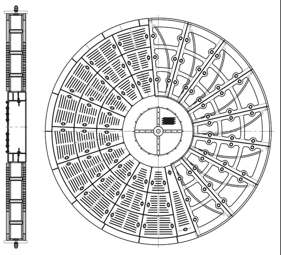 结构方面,在考虑研磨体填充率与料面的情况下,尽可能增大中心圆的直径,隔仓两侧采用篦板,篦缝宽度为 6 mm,通孔率为 7.8%,两侧篦板的通孔率保持一致,可改善隔仓截面通风,降低通风阻力和中心圆处风速。物料流动方向安装有闸板,现场可根据粉磨工艺及物料特性等来控制物料的流速,从而提高产品的质量和产量。