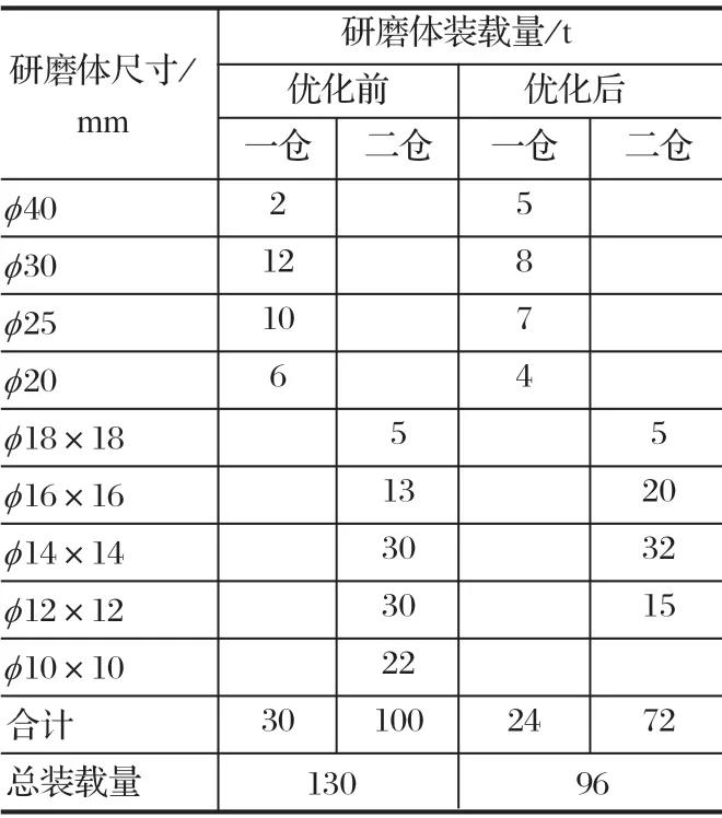 由于对磨内衬板、隔仓装置和出料篦板进行了优化,使得研磨效率提高,因而可适当减少研磨体填充量,将一仓和二仓的填充率由 28% 降至 22%,降低了磨机负荷,进而降低了电耗。优化前后研磨体级配如表 1 所列。