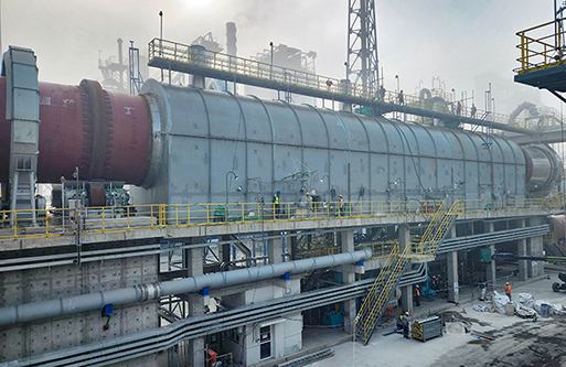 转化焙烧:锂辉石精矿从精矿库人工送至斗式提升机提升至精矿仓,再经圆盘给料机和螺旋给料机加入碳酸锂回转窑窑尾,利用窑尾预热段高温气体干燥精矿,精矿在煅烧段约1200℃左右的温度下进行晶型转化焙烧,由α型(单斜晶系,密度3150kg/m3)转化为β型锂辉石(四方晶系,密度2400kg/m3,即焙料),转化率约98%。